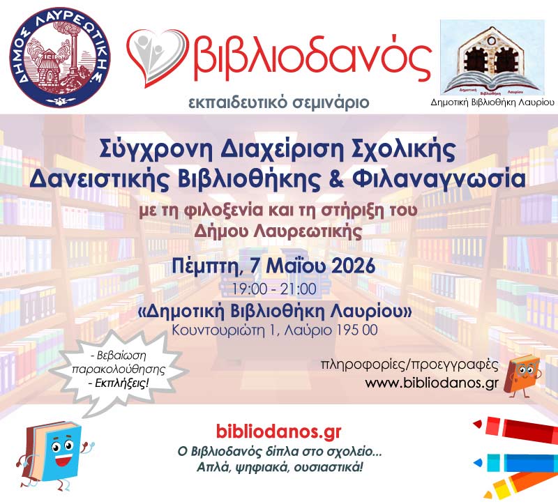 Σας προσκαλούμε σε ένα σεμινάριο, όπου θα αφήσουμε για λίγο τη θεωρία και θα δούμε στην πράξη πώς η τεχνολογία μπορεί να υπηρετήσει τη Φιλαναγνωσία. Μέσα από την πλατφόρμα του Βιβλιοδανού, θα ανακαλύψουμε πώς η ψηφιακή διαχείριση (από την καταλογογράφηση μέχρι το δανεισμό) μπορεί να γίνει απλή, γρήγορη και απόλυτα λειτουργική για κάθε σχολική μονάδα.
